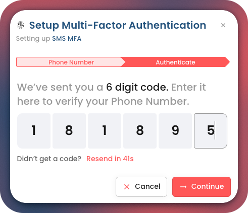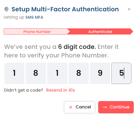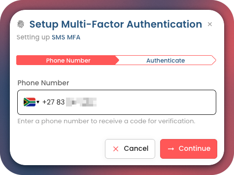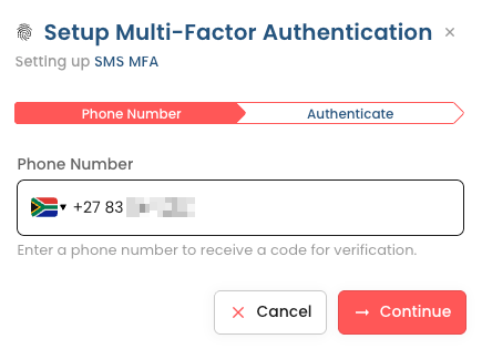 Enter a phone number to verify for MFA. Ensure that you use the international number format when entering your phone number.
