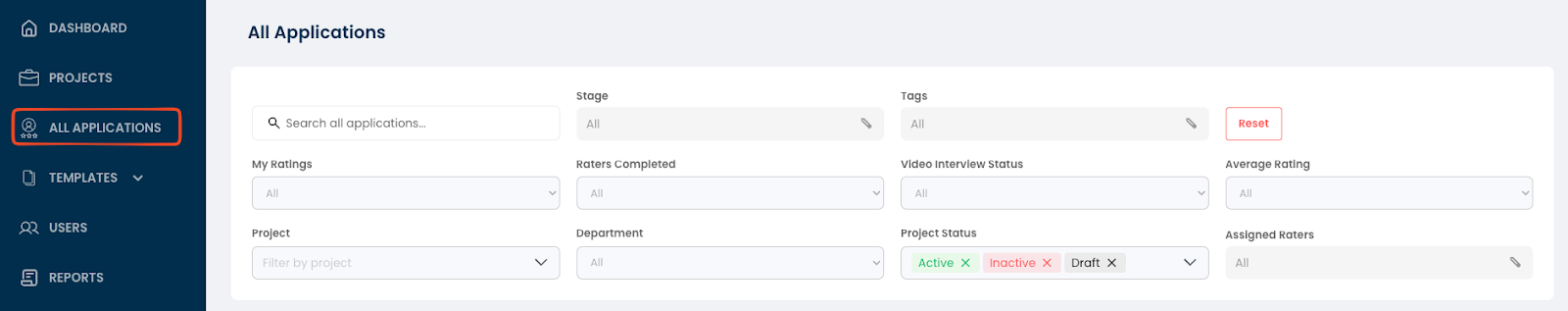 - Visibility Rules: By default, "All Applications" only shows candidates in Active, Inactive, or Draft projects. Candidates in Archived projects are hidden unless specifically added to the filter.