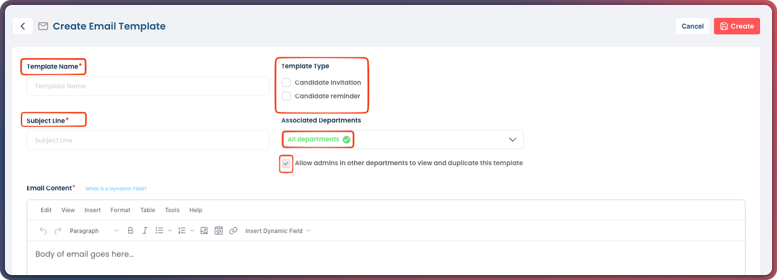 - You will also be able to specify the Template Type if it is for a Candidate Invitation email welcoming them to the application process or a Candidate Reminder email to remind them they still need to complete their application.
