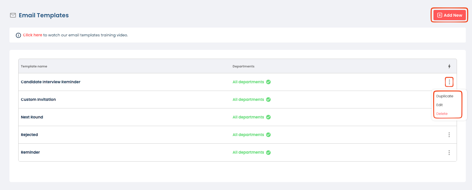 - To create a new email template click on the “Add New” button at the top right of the screen.